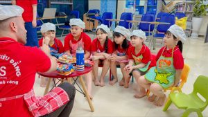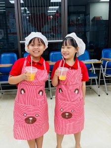 Dưới sự hướng dẫn của giáo viên bản ngữ và giáo viên Việt Nam, các con được học và thực hành những từ vựng tiếng Anh về nguyên liệu, dụng cụ và thao tác chế biến như orange, knife, squeezer, juice, sugar, stir, pour,… cùng các mẫu câu giao tiếp sinh động: