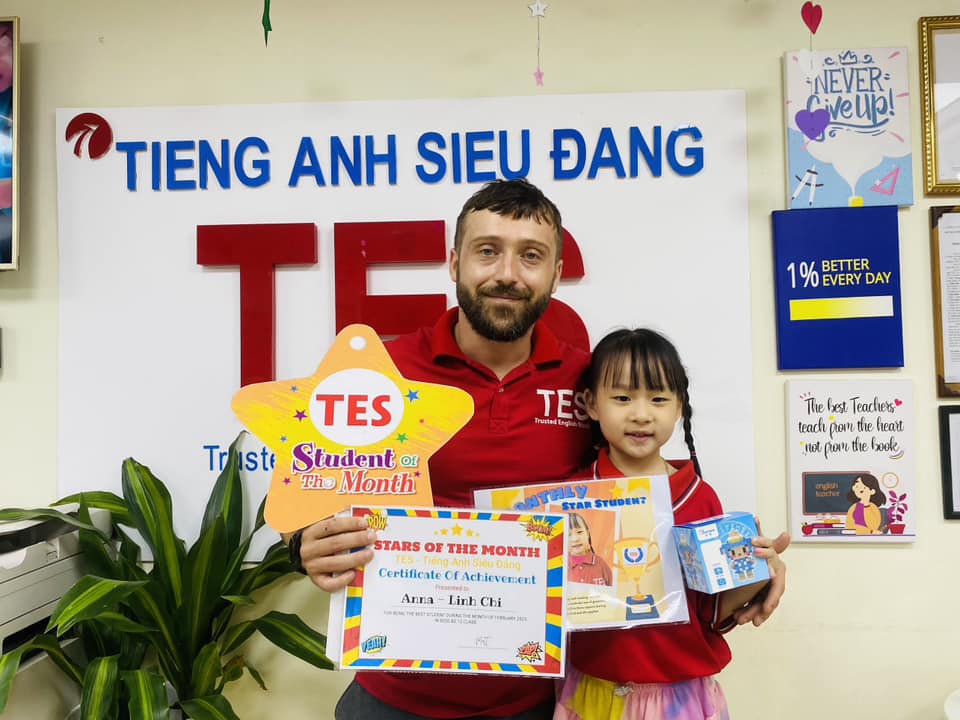 Trong tất cả các thầy cô tại TES, con thích thầy Matt nhất. Thầy luôn rất vui tính, thân thiện và luôn nở nụ cười thật tươi mỗi khi bước vào lớp. Nhờ có thầy, không khí học tập lúc nào cũng thoải mái, vui vẻ và tràn đầy năng lượng tích cực. Bài giảng của thầy rất dễ hiểu, bởi thầy biết cách giải thích sinh động qua những câu chuyện hài hước bằng tiếng Anh, khiến chúng con cảm thấy tiếng Anh không còn là môn học khó, mà trở nên gần gũi và thú vị.