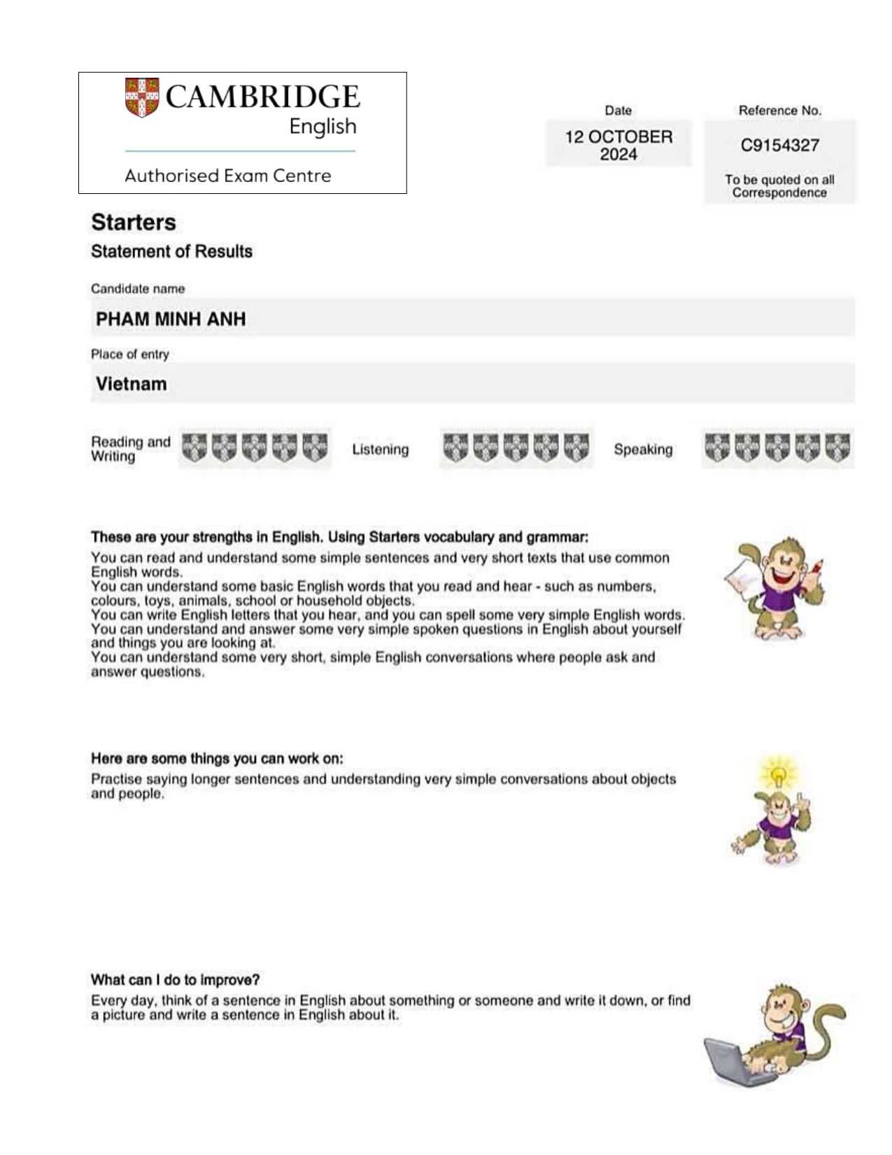 Nhờ sự tận tâm của thầy cô và sự đồng hành của bạn bè, con cảm thấy mình tiến bộ hơn từng ngày, từ cách phát âm, phản xạ, cho đến khả năng trình bày ý tưởng bằng tiếng Anh. Tiếng Anh giờ đây không chỉ là một môn học mà đã trở thành một phần quan trọng trong cuộc sống của con – giúp con tự tin hơn, năng động hơn và sẵn sàng chinh phục nhiều thử thách mới trong tương lai.