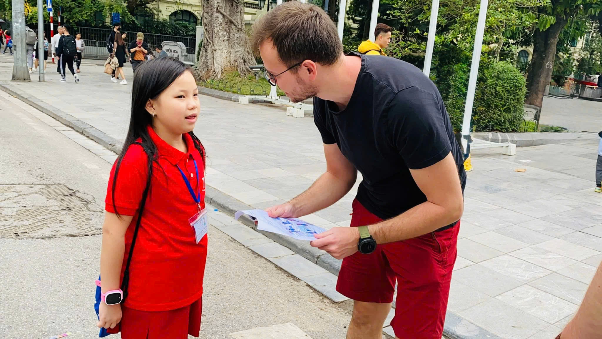 Những nụ cười, lời chào, hay câu hỏi nhỏ mà các con tự tin cất lên với du khách chính là bước khởi đầu cho năng lực giao tiếp toàn cầu.
