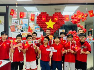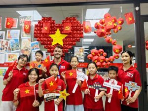 Không khí tại TES trở nên rực rỡ và ấm áp hơn bao giờ hết. Màu cờ đỏ sao vàng phủ khắp các lớp học, những lá cờ nhỏ tung bay trong tay các con, cùng tiếng cười giòn giã và ánh mắt rạng rỡ của thầy trò. Cả trung tâm vang lên khẩu hiệu “Tự hào Việt Nam – Tự tin vươn ra thế giới!”, thể hiện niềm tin, niềm tự tôn dân tộc và khát vọng hội nhập.